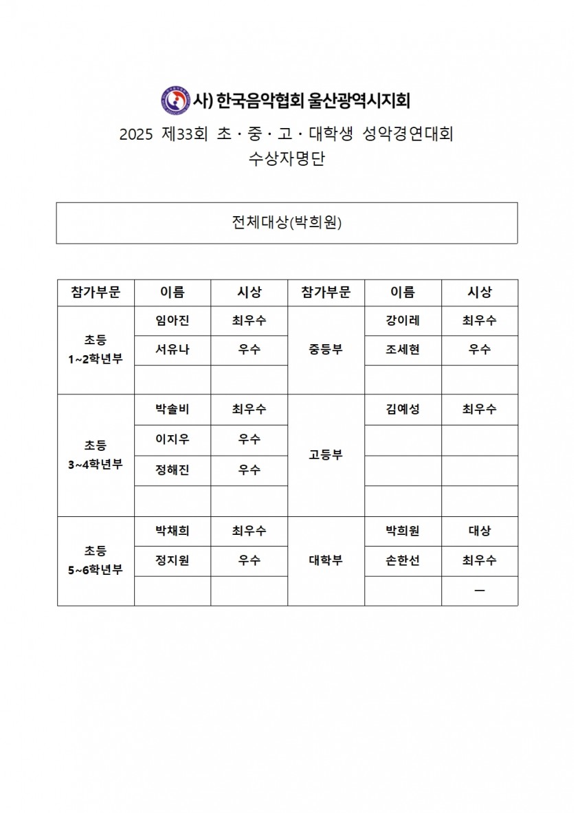 2025 제 33회 울산음악협회 성악경연대회 수상자명단