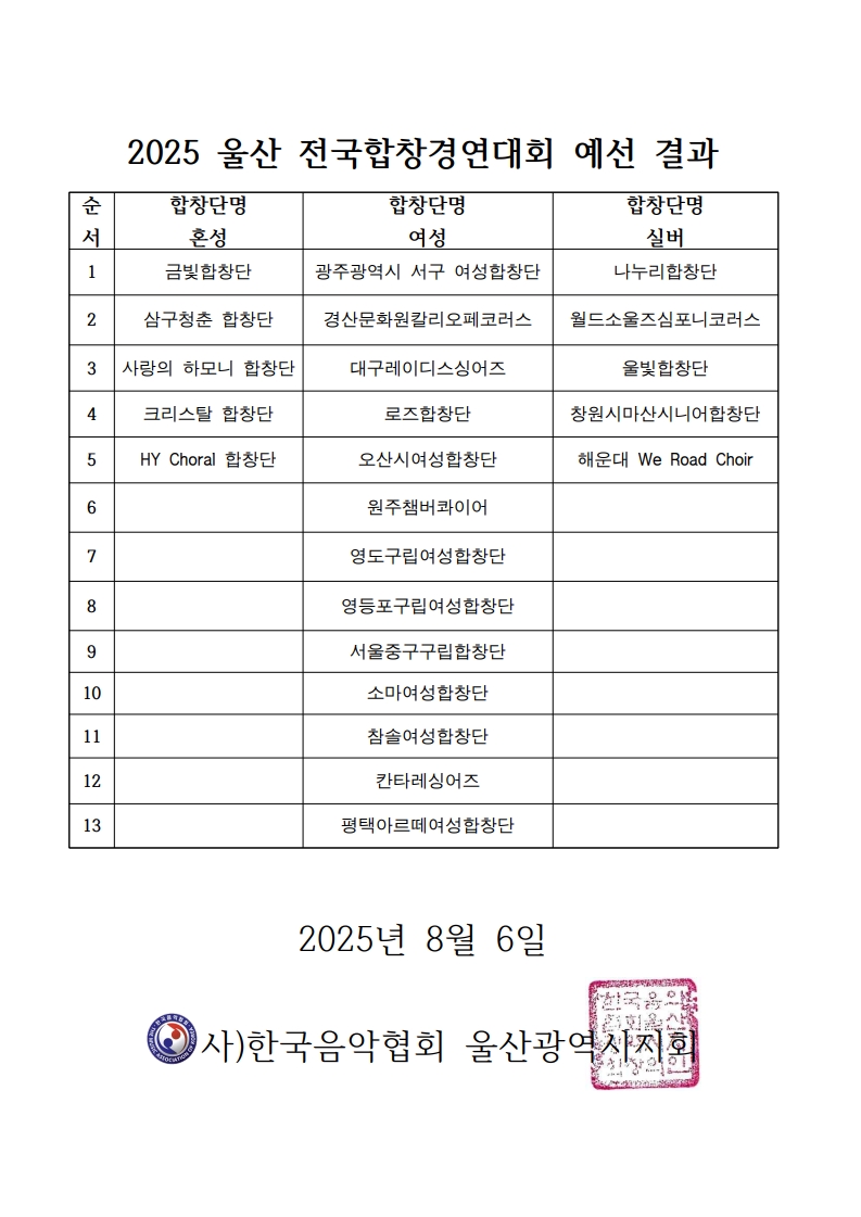 2025 제 3회 울산전국합창경연대회 예선결과 안내